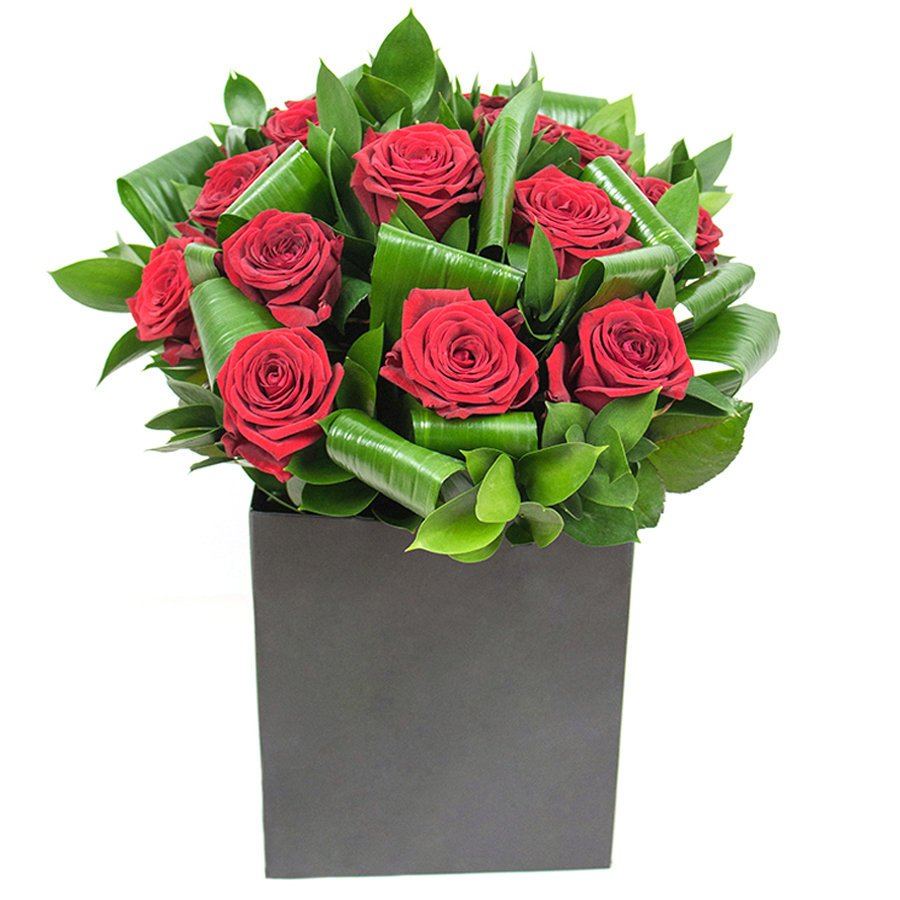 Embrace the classic elegance of our hand-picked red roses, beautifully combined with aspidistra leaves and ruscus. This unique bouquet adds grace and style to any environment, making it an ideal gift for loved ones or a sophisticated addition to your home.